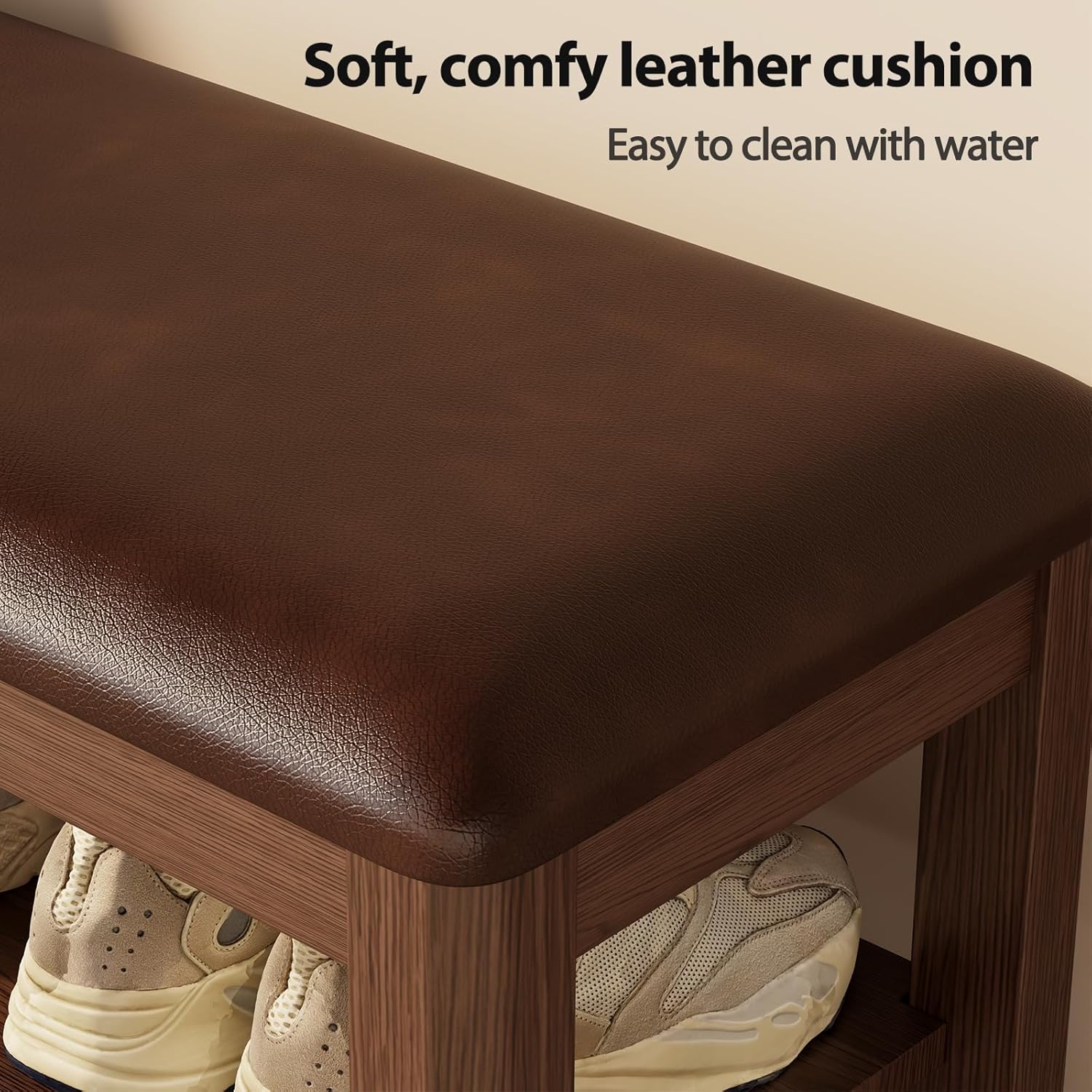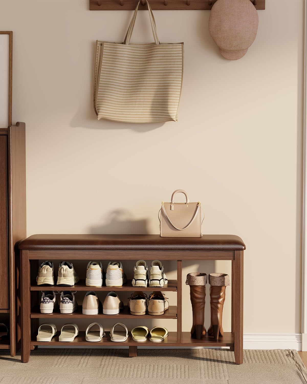 3 Tier Shoe Bench with Cushion,Solid Wood Storage Bench Height Adjustable, Shoe Rack for Entryway,Bedroom,Hallway(Walnut)