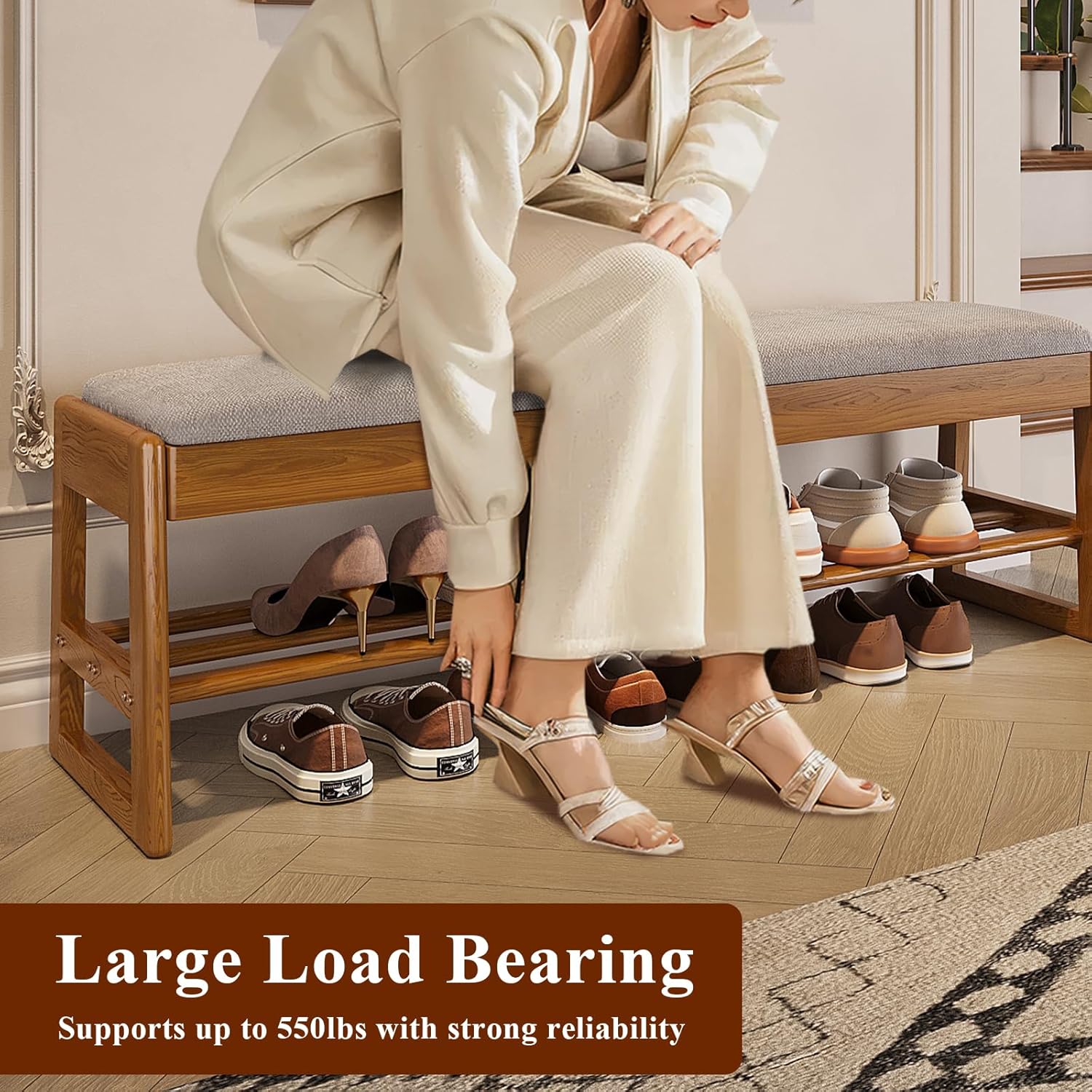Shoe Rack Bench with Cotton-Linen Cushion 2-Tier Wooden Storage Bench 550lbs Compact Simple & Modern Design for Entryway, Hallway, Bedroom, Living Room, Closet, Front Door Entrance, Foyer