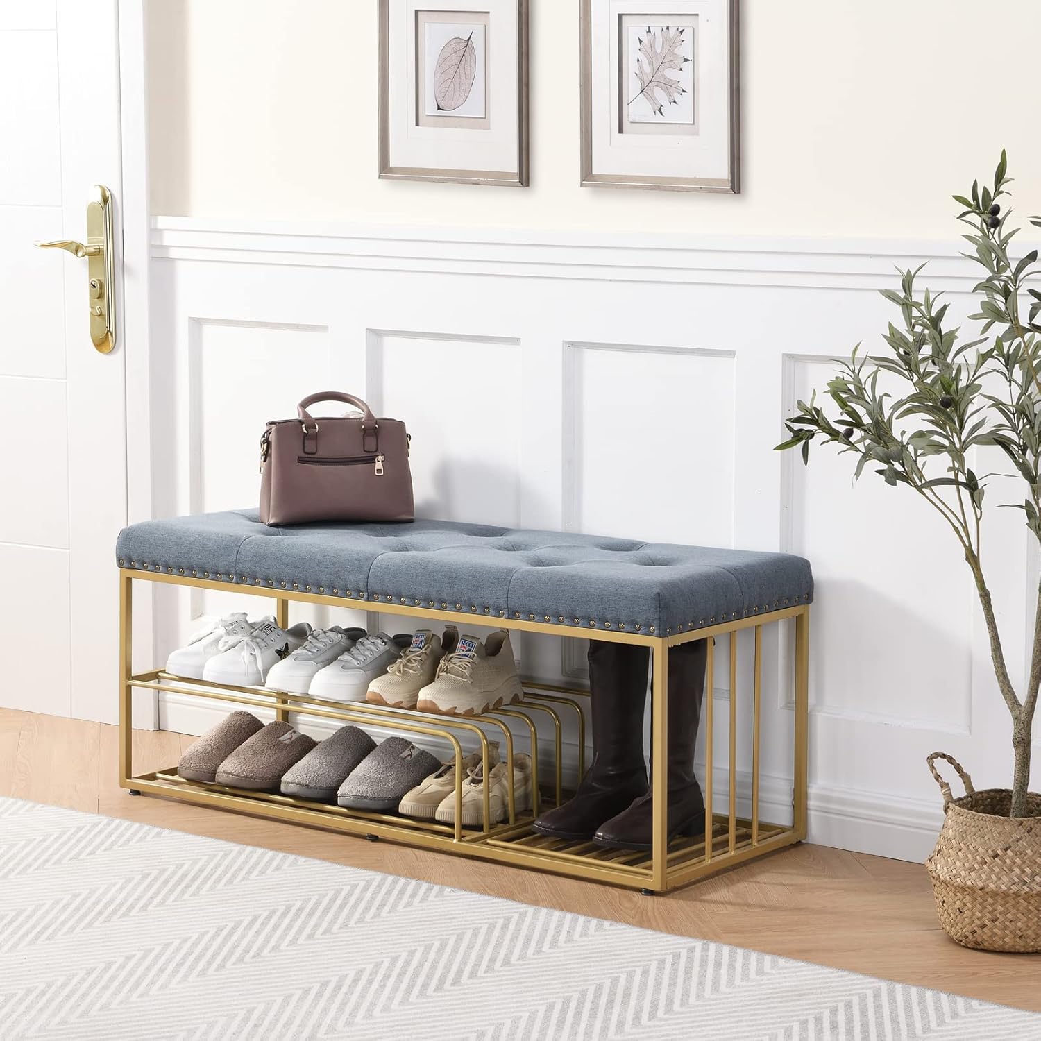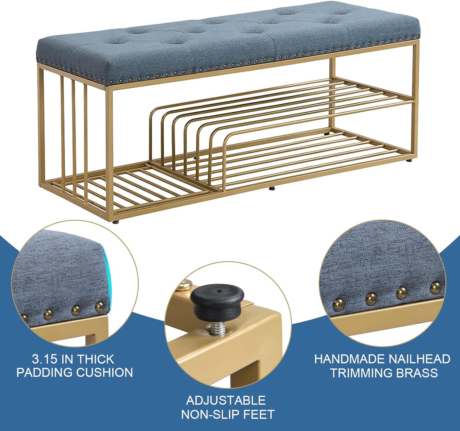 Upholstered Shoe Storage Bench-Nailhead Trim Linen Ottoman Bench with Shoes Rack for End of Bed Entryway Window Bedroom Living Mudroom Room,Blue